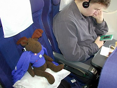 I met the famous Kathy Schrock, who picks out great web sites for teachers. I saw a really neat carousel, which I did NOT get to ride on because this little kid wouldn't get out of the plane.But Stephen and I played video games together in the hotel later on and I cheered right up.On the way home I was wide awake at first. But later on I got tired of watching Pinocchio on the movie screen and put on my Swissair eyeshades and went to sleep. (I'll bring them home so you can try them on.)